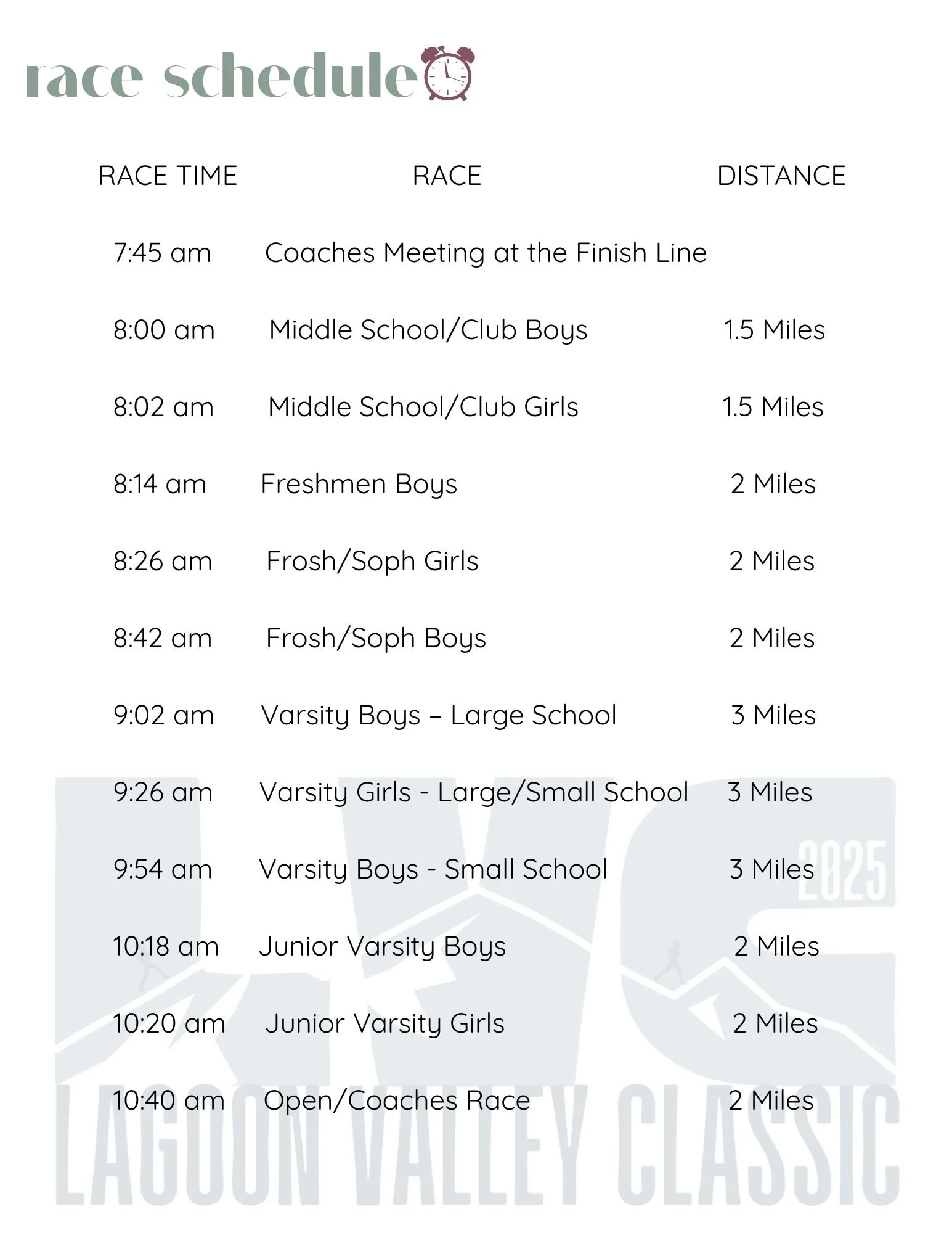Athletes competing need to arrive 75 minutes prior to their race or no later than 7:30am, whichever is earliest. If you are dropping off your athlete please enter through front gate, drop off in main lot and exit through front gate.